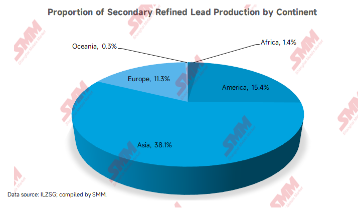 According to ILZSG data, global secondary refined lead production is mainly distributed in Asia, the Americas, and Europe.