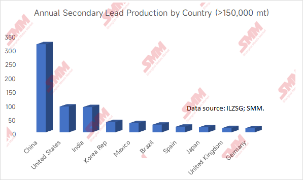 Ten countries have annual secondary refined lead production exceeding 150,000 mt, with China, the US, and India ranking as the top three.
