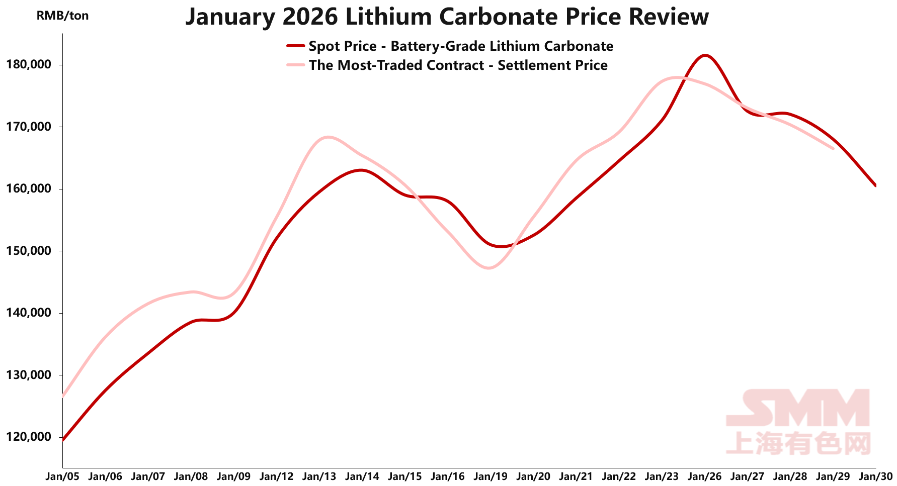The SMM battery-grade lithium carbonate price on January 12 rose 8.57% WoW from the previous working day, representing the largest price increase for the month. As prices continued to climb, the average spot price touched the monthly high on January 26, directly breaking through the 180,000 yuan mark, with an average price of 181,500 yuan/mt.