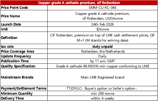 Against this backdrop, Shanghai Metals Market (SMM) officially launched the Copper grade A cathode premium, cif Rotterdam, USD/(tonne) on February 24th, 2026. This price reflects the premium of LME-registered brand bills of lading delivered on a CIF Rotterdam term, incorporating factors such as warehouse circulation costs, regional logistics and freight rates, trading activity, and brand preferences, to form a representative market settlement reference price.