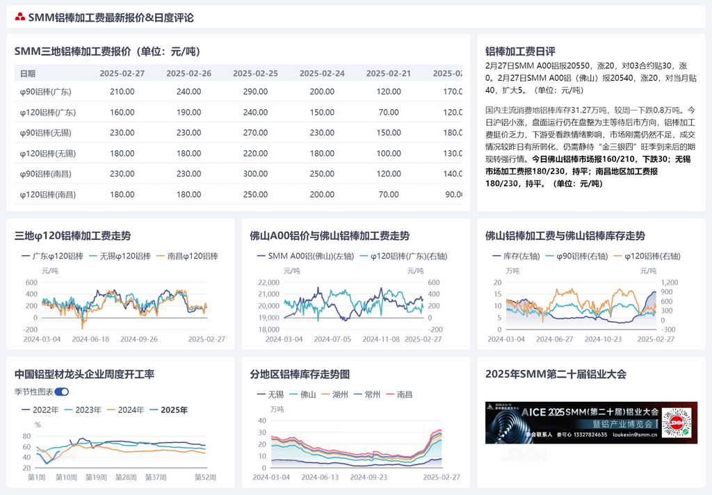 El 27 de febrero, el aluminio A00 de SMM se cotizó en 20,550 yuanes/tonelada, subiendo 20 yuanes/tonelada, con un descuento de 30 yuanes/tonelada frente al contrato de marzo, sin cambios. El mismo día, el aluminio A00 de SMM (Foshan) se cotizó en 20,540 yuanes/tonelada, subiendo 20 yuanes/tonelada, con un descuento de 40 yuanes/tonelada frente al contrato del mes actual, ampliándose en 5 yuanes/tonelada. (Unidad: yuanes/tonelada)