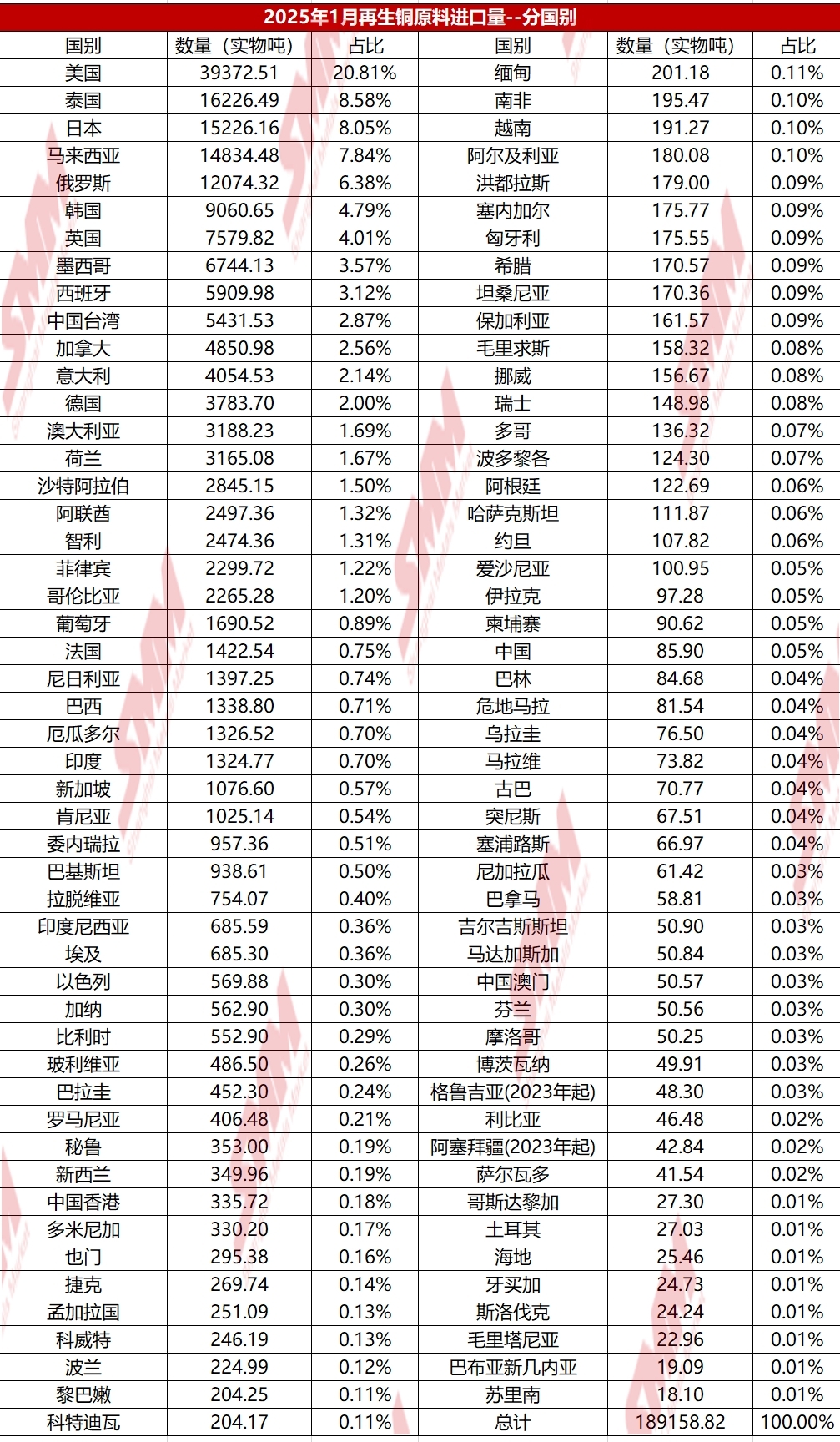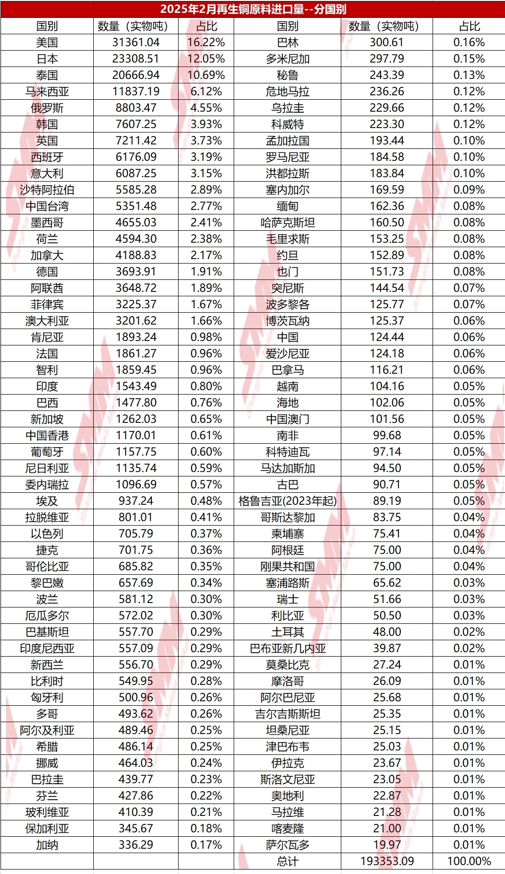En resumen, a corto plazo, es poco probable que la escasez de materias primas secundarias de cobre se alivie. Afectada por la expectativa de los aranceles de Trump y los altos precios globales del cobre, la situación de pérdidas en las importaciones puede no mejorar, y la disposición de los comerciantes a comprar puede permanecer baja, lo que lleva a un débil crecimiento en las importaciones. Por lo tanto, se espera que las exportaciones de chatarra de cobre de EE. UU. a China en marzo de 2025 puedan seguir disminuyendo, comprimiendo aún más las fuentes de importación. A mediano y largo plazo, si los precios globales del cobre retroceden, la cadena de suministro se estabiliza y China aumenta el apoyo político a los recursos reciclados, se espera que las importaciones de cobre secundario se recuperen gradualmente. Además, la creciente demanda de cobre de industrias aguas abajo como la nueva energía y la electrónica también puede impulsar un aumento en las importaciones. Sin embargo, la estructura de importación puede experimentar una transformación, con una mayor proporción de suministros provenientes del sudeste asiático y Europa, para reducir la dependencia del mercado estadounidense. (A continuación, se presentan los datos específicos de importación por país para enero-febrero de 2025)