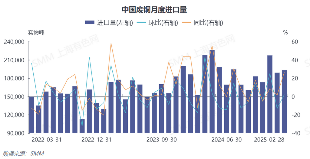 Según los últimos datos de la Administración General de Aduanas, las importaciones de chatarra de cobre y chatarra de cobre triturada de China en enero de 2025 fueron de 189,200 toneladas, una disminución del 13.03% mensual y un aumento del 1.48% interanual. En febrero, las importaciones aumentaron ligeramente a 193,400 toneladas, un incremento del 2.22% mensual y del 26.77% interanual. Las importaciones acumuladas de enero a febrero de 2025 fueron de 382,500 toneladas, un aumento del 12.86% interanual (código HS 74040000).