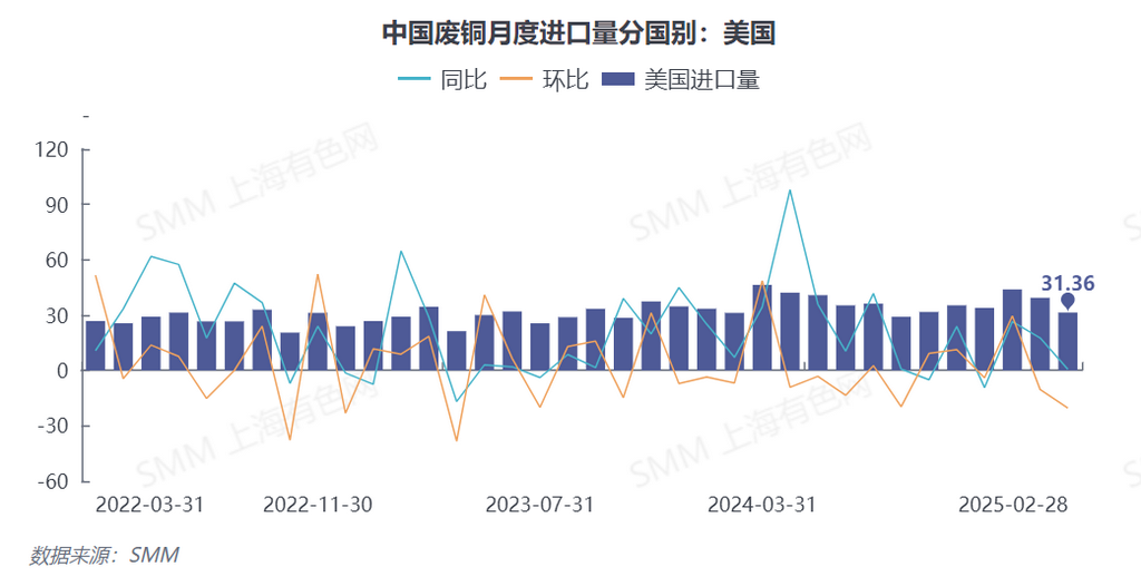 Un desglose detallado de las fuentes de importación muestra fluctuaciones significativas en las importaciones de materias primas secundarias de cobre durante enero-febrero de 2025, siendo el factor de EE. UU. particularmente destacado. Los datos de aduanas indican que en enero, EE. UU. exportó 39,400 toneladas de chatarra de cobre y chatarra de cobre triturada a China, una disminución del 10.32% mensual pero un aumento del 17.66% interanual, representando el 20.81% del total de importaciones de China, ocupando el primer lugar. En febrero, las exportaciones de EE. UU. a China cayeron a 31,400 toneladas, una disminución del 20.35% mensual y un aumento de solo el 0.55% interanual. Aunque EE. UU. sigue siendo la mayor fuente de importaciones secundarias de cobre para China, su participación ha disminuido significativamente al 16.22%.