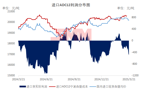 [Precios de importación más fuertes, las pérdidas instantáneas para ADC12 importado continúan ampliándose] Hoy, los precios del aluminio tuvieron ajustes menores. El precio de aluminio SMM A00 disminuyó 20 yuanes/tonelada respecto al día de negociación anterior, situándose en 20,790 yuanes/tonelada, mientras que los precios del aluminio secundario se mantuvieron mayormente estables. Los precios nacionales de SMM ADC12 permanecieron sin cambios en 21,100-21,300 yuanes/tonelada en comparación con ayer; en el mercado de importación, los precios de ADC12 en el extranjero fueron relativamente fuertes, con cotizaciones por encima de $2,500/tonelada. Mientras tanto, los precios nacionales enfrentaron presión recientemente, y con una ligera caída en el tipo de cambio del RMB, la pérdida instantánea para ADC12 importado se amplió a 500 yuanes/tonelada. Hoy, las fluctuaciones en los precios del aluminio fueron relativamente pequeñas, y el mercado de aluminio secundario se mantuvo estable. Actualmente, la demanda aguas abajo sigue siendo débil, y a corto plazo, es más probable que el mercado caiga que suba.