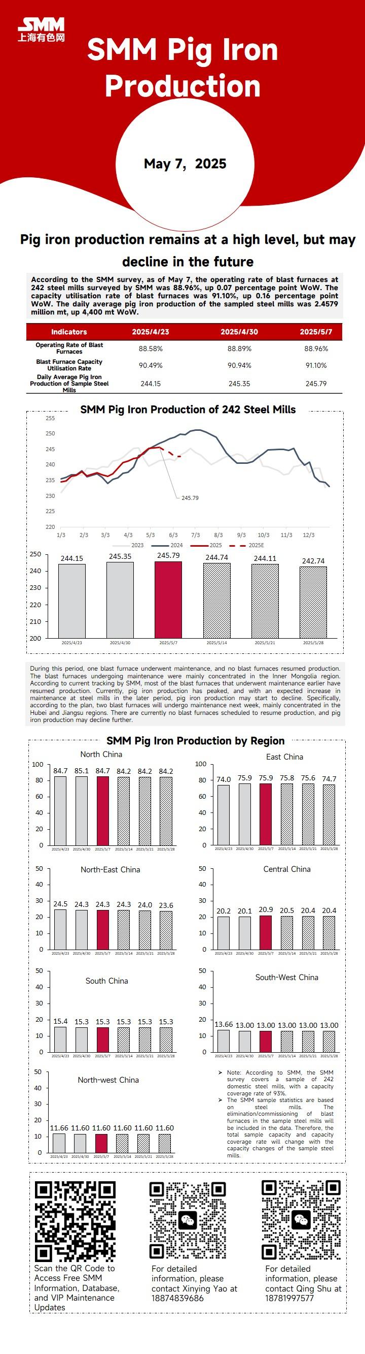 Según la encuesta de SMM, hasta el 7 de mayo, la tasa de funcionamiento de los altos hornos en 242 siderúrgicas encuestadas por SMM fue del 88,96 %, un aumento de 0,07 puntos porcentuales semana a semana.