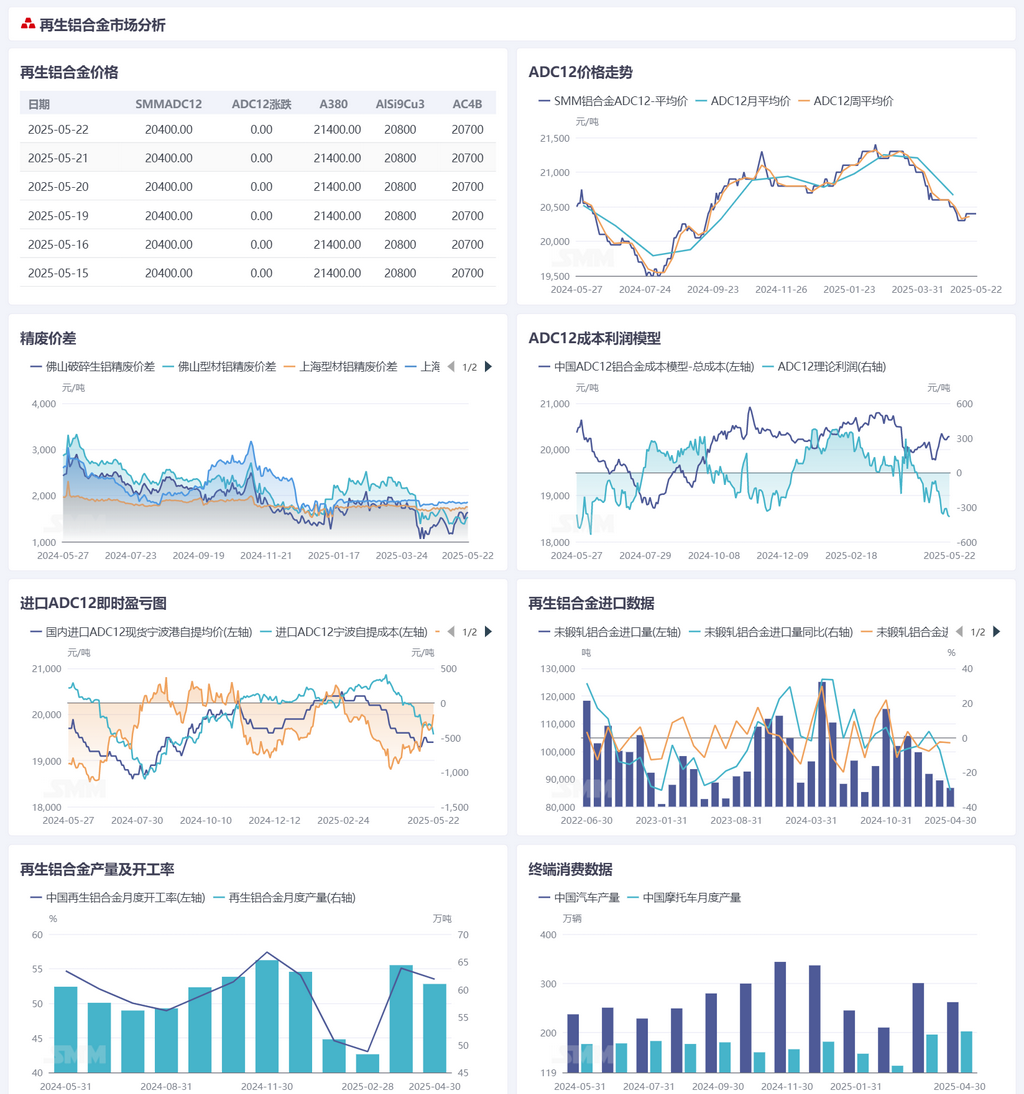 Esta semana, el mercado de aleación de aluminio secundario tendió a estabilizarse. Al 22 de mayo, los precios SMM ADC12 se mantuvieron sin cambios semanales en 20.300-20.500 yuanes/tonelada. El principal desequilibrio actual del mercado sigue centrado en la débil demanda de uso final en temporada baja, con precios que carecen de impulso alcista. Sin embargo, el lado de los costos brinda apoyo a los precios. Desde una perspectiva de estructura de costos, los precios de la chatarra de aluminio siguen siendo altos, representando casi el 90% de los costos de producción de ADC12, lo que constituye la principal carga de costos. En términos de materias primas de silicio, los precios del silicio continuaron disminuyendo, con los precios del silicio #553 con soplado de oxígeno cayendo 450 yuanes/tonelada semanalmente hasta 8.650 yuanes/tonelada, y su participación en los costos se redujo al 2,4%. En el lado de la demanda, la demanda de uso final siguió siendo débil. Algunas empresas de fundición a presión informaron una disminución del 30% mensual en los pedidos de mayo, y la mayoría mantuvieron las compras según sea necesario. Junto con el sentimiento bajista entre algunos actores de la cadena de suministro, la entusiasmo general por las compras fue bajo. El lado de la oferta mostró una ligera divergencia, con la producción de las grandes empresas manteniéndose relativamente estable y solo una reducción limitada en sus tasas de operación. Sin embargo, las tasas de operación de las pequeñas y medianas empresas disminuyeron significativamente, y algunas informaron que prácticamente cerraron en mayo, principalmente debido a la insuficiencia de pedidos y las pérdidas. En términos de importaciones, las cotizaciones en el extranjero continuaron cayendo ligeramente esta semana hasta 2.380-2.400 dólares/tonelada. Los precios spot de importación nacionales se situaron en 19.300-19.500 yuanes/tonelada. Junto con la apreciación del tipo de cambio del yuan, las pérdidas de importación inmediatas se redujeron significativamente hasta 100-200 yuanes/tonelada. Sin embargo, la ventana de importación permaneció cerrada, y la demanda de uso final se ha debilitado desde abril. Se espera que las importaciones se mantengan en un nivel bajo en el segundo trimestre. A corto plazo, se espera que los precios de la aleación de aluminio secundario mantengan un patrón fluctuante dentro de un rango, y la débil demanda seguirá limitando el espacio alcista de los precios. No obstante, el apoyo de los costes sigue existiendo. De cara al futuro, es necesario vigilar de cerca la situación del suministro de materias primas, los cambios en los volúmenes de pedidos y el progreso de las reducciones de producción en las empresas de aluminio secundario. Si la escala de las reducciones de producción en el sector supera las expectativas, podría proporcionar cierto apoyo a los precios debido a la contracción de la oferta.
