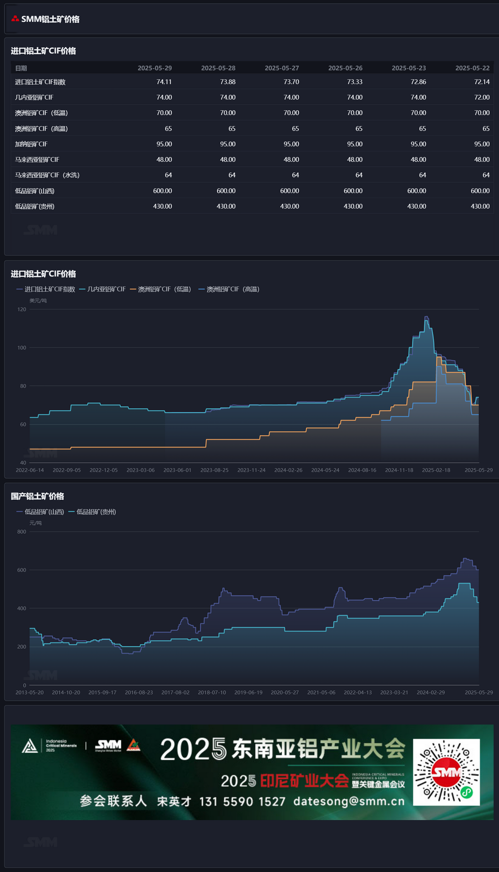 Comentario de SMM:No ha habido avances en el incidente de los derechos mineros de bauxita de Guinea, y los proveedores de bauxita no tienen una fuerte tendencia a vender a precios bajos. Sin embargo, la capacidad operativa de la alúmina aún no ha experimentado un repunte significativo. A corto plazo, se espera que la situación fundamental del mercado de bauxita siga en un excedente, con intenciones generales de comprar bauxita a precios altos. A corto plazo, se espera que los precios de la bauxita importada entren en una fase de ajuste volátil. Será necesario realizar un seguimiento estrecho de la situación de suministro de Guinea en el futuro.