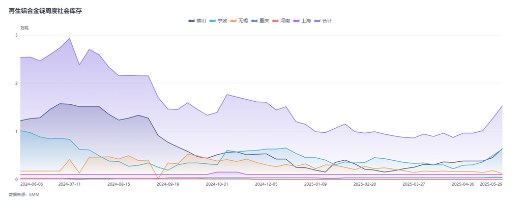 En el lado de la demanda, la demanda de mayo siguió bajo presión, convirtiéndose en el principal factor que limitaba los precios. Las características tradicionales de temporada baja surgieron y se profundizaron gradualmente, con la contracción de los pedidos nacionales y extranjeros, lo que llevó a un comercio de mercado generalmente lento. Además, las importantes fluctuaciones de los precios del aluminio en mayo intensificaron la actitud de espera y observación de los clientes finales, aumentando la presión de ventas para las empresas de aluminio secundario y la acumulación continua de inventarios de productos terminados. En consecuencia, los precios de las aleaciones de aluminio secundario se enfrentaron a un dilema de "más probabilidades de caer que de subir". Aunque la declaración conjunta de las conversaciones comerciales entre China y Estados Unidos en Ginebra a mediados de mes sobre reducciones arancelarias mutuas y un período de observación emitieron señales positivas, no mostraron un claro impulso al consumo de aluminio secundario. Además, limitado por la temporada baja, el inventario social de aleaciones de aluminio aumentó significativamente en 5.740 toneladas hasta las 15.339 toneladas de principio a fin de mes, acelerando la acumulación de inventarios.