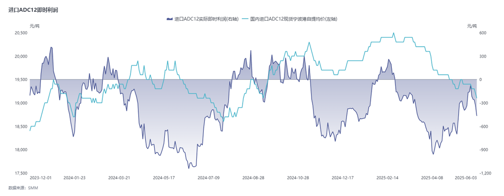 En cuanto a las importaciones, los datos aduaneros mostraron que las importaciones de aleaciones de aluminio sin elaborar de China totalizaron 86.800 toneladas en abril de 2025, lo que representa una disminución del 30,6% interanual y del 3,0% mensual. Las importaciones acumuladas de enero a abril de 2025 ascendieron a 367.800 toneladas, con una disminución del 11,4% interanual. Las importaciones de aleaciones de aluminio sin elaborar en 2025 se han mantenido por debajo de las 100.000 toneladas mensuales, con cuatro meses consecutivos de descenso. En febrero de este año, la diferencia de precios de importación se recuperó brevemente de la inversión a largo plazo hasta niveles cercanos al punto de equilibrio. Sin embargo, desde finales de febrero hasta abril, los precios internacionales de ADC12 siguieron fortaleciéndose, alcanzando un máximo de 2.510 dólares por tonelada. Mientras tanto, los precios al contado nacionales siguieron disminuyendo, lo que provocó nuevas pérdidas de importación que se ampliaron progresivamente, lo que resultó en una contracción de las importaciones de lingotes de aleación de aluminio. Actualmente, las ofertas internacionales han retrocedido a 2.380-2.400 dólares por tonelada, mientras que los precios al contado nacionales de importación oscilan entre 19.000 y 19.200 yuanes por tonelada, con pérdidas de importación inmediatas de 300-500 yuanes por tonelada. La ventana de importación permanece cerrada y, junto con las expectativas de un debilitamiento de la demanda, se espera que las importaciones del segundo trimestre se mantengan bajas, con volúmenes mensuales probablemente por debajo de las 100.000 toneladas.