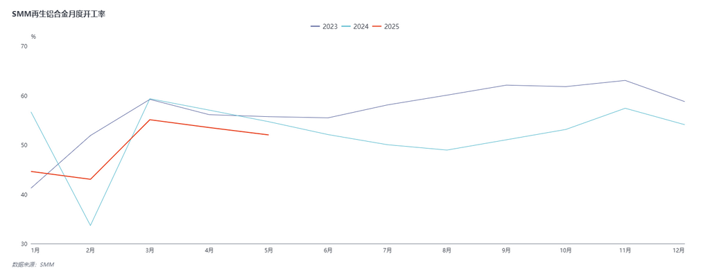 En el lado de la oferta, la tasa de funcionamiento en el sector de aleaciones de aluminio secundario cayó ligeramente en 1,49 puntos porcentuales intermensual hasta el 52,01% en mayo, un 2,67% interanual. Aunque después de las vacaciones del Día del Trabajo se registró una ligera recuperación de las tasas de funcionamiento, bajo las presiones triples de altos costos, pedidos insuficientes y pérdidas de producción persistentes, la tasa de funcionamiento general del sector mostró una tendencia a la baja, con frecuentes cortes y paradas de la producción. Las pequeñas y medianas empresas se vieron especialmente afectadas, con tasas de funcionamiento que disminuyeron significativamente, y algunas empresas estuvieron básicamente en estado de cierre. En contraste, las grandes empresas mantuvieron una producción relativamente estable debido a sus ventajas inherentes. Al entrar en junio, la temporada baja tradicional continúa. Dado que las tasas de funcionamiento ya experimentaron caídas concentradas de abril a mayo, se espera que la caída en junio sea limitada. El 10 de junio, los futuros de aleaciones de aluminio fundido debutarán oficialmente en la SHFE, siendo el primer contrato cotizado AD2511. Dado que el período de entrega aún está lejos, las empresas de aluminio secundario designadas como marcas de entrega no ampliarán su capacidad de producción a corto plazo, y es poco probable que el panorama de la oferta experimente cambios significativos debido a la cotización de futuros.