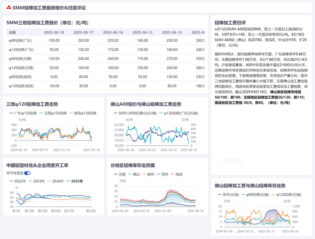 Según las estadísticas de SMM, en cuanto al inventario de palanquillas de aluminio en dos localidades nacionales, el inventario de palanquillas de aluminio en Guangdong fue de 56.800 toneladas, y el inventario de palanquillas de aluminio en Wuxi fue de 19.800 toneladas, totalizando 76.600 toneladas, una disminución de 1.400 toneladas intermensual. Los precios del aluminio en la SHFE aumentaron continuamente, y el aluminio A00 al contado en el este de China se acercó gradualmente al umbral de 21.000 yuanes/tonelada. Recientemente, el mercado de palanquillas de aluminio ha registrado un rendimiento de transacciones lento debido a la presión de los altos precios del aluminio, y el inventario de palanquillas de aluminio también ha experimentado una desaceleración significativa en la reducción de existencias. La actitud de los clientes finales se caracteriza fuertemente por el miedo a los altos precios, y las cotizaciones del mercado están muy polarizadas. El centro general de las tarifas de procesamiento de palanquillas de aluminio en tres localidades nacionales se ha desplazado significativamente hacia abajo, con tarifas de procesamiento en Wuxi y Foshan que muestran cotizaciones de dos dígitos, e incluso tarifas de procesamiento cero o negativas en la región de Nanchang, lo que resulta en un rendimiento de transacciones sombrío. Hasta el 18 de junio de 2025, el mercado de palanquillas de aluminio en la región de Foshan se cotizó en 50/100 yuanes/tonelada, 100 yuanes/tonelada menos; las tarifas de procesamiento de palanquillas de aluminio en la región de Wuxi se cotizaron en 50/130 yuanes/tonelada, 110 yuanes/tonelada menos; y las tarifas de procesamiento en la región de Nanchang se cotizaron en -50/0 yuanes/tonelada, 80 yuanes/tonelada menos (Unidad: yuanes/tonelada).