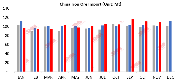 En noviembre, China importó 110,54 millones de toneladas de mineral de hierro y concentrados, una disminución de 769.000 toneladas respecto al mes anterior, lo que representa un descenso del 0,7% mensual. Las importaciones acumuladas de enero a noviembre totalizaron 1139,202 millones de toneladas, un aumento del 1,4% interanual. En el contexto de que la industria siderúrgica entró en la temporada baja tradicional en noviembre, la demanda de consumo de acero por parte de los usuarios finales se debilitó y los beneficios de las acerías se mantuvieron bajo presión. Además de que algunas empresas controlaron proactivamente la producción en respuesta a las políticas de protección ambiental y producción escalonada, el mantenimiento anual de los altos hornos también se llevó a cabo gradualmente. La producción total de arrabio disminuyó ligeramente desde el nivel relativamente alto del mes anterior, lo que provocó una disminución sincronizada en la demanda de mineral de hierro. Mientras tanto, el inventario portuario se mantuvo en un nivel relativamente alto y la oferta general del mercado fue amplia. Con bajos beneficios de importación y un diferencial de precios entre el mercado físico y de futuros poco atractivo, el entusiasmo de los importadores por retirar carga fue generalmente bajo, lo que suprimió aún más las importaciones reales en noviembre.