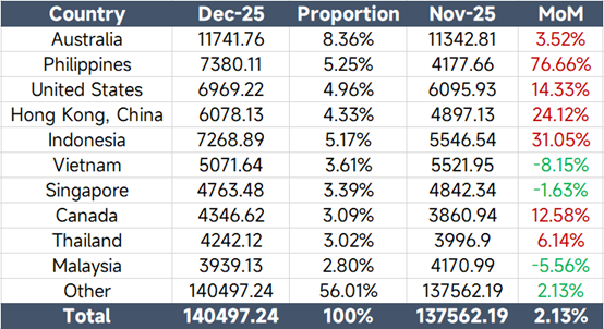 En el mercado de exportación, el número de países y regiones cubiertos por las exportaciones chinas de alambre y cable de cobre aumentó a 205 en diciembre de 2025, registrando crecimiento durante dos meses consecutivos. Entre los destinos de exportación, Australia mantuvo el primer puesto, mientras que Filipinas y Estados Unidos ocuparon el segundo y tercer lugar, respectivamente. Las exportaciones a estos tres países alcanzaron 1,17 kt, 0,74 kt y 0,7 kt durante el mes. Cabe destacar que la clasificación de Filipinas subió significativamente del noveno al segundo lugar, impulsada principalmente por la demanda rígida de la infraestructura doméstica y la expansión manufacturera, junto con los efectos de las entregas concentradas de pedidos de fin de año y el acopio.