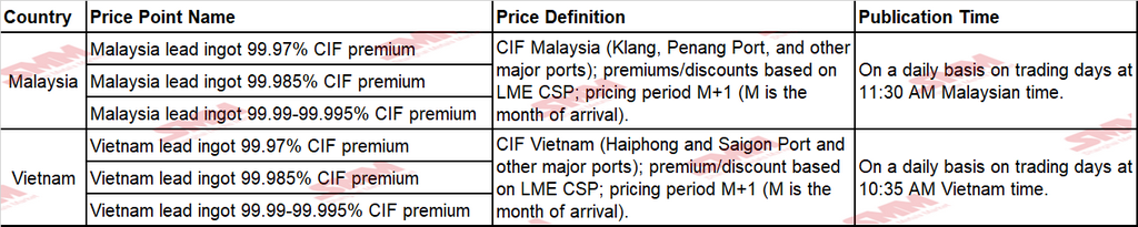 Price[SMM Announcement] Launch of CIF Premiums by Lead Content for Lead Ingots from Vietnam and Malaysia