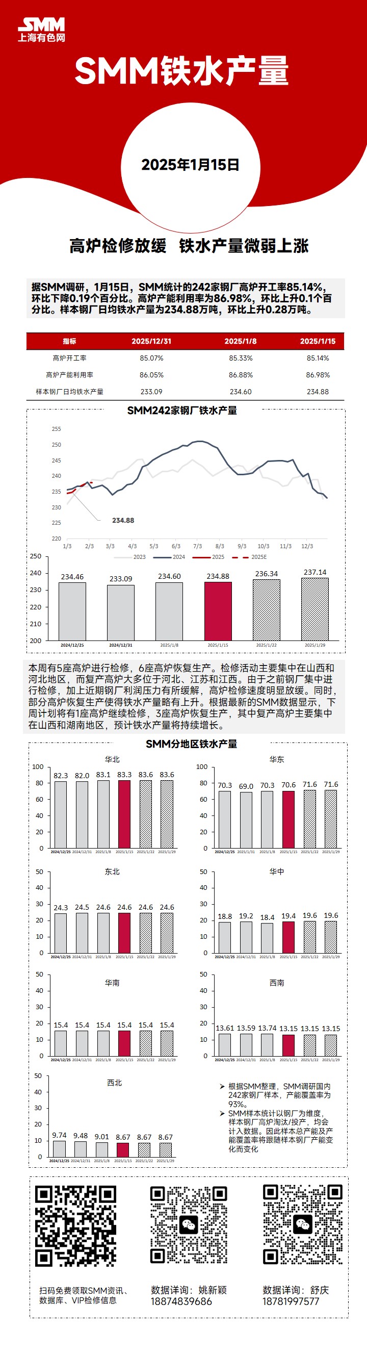 Selon l'enquête de SMM, au 15 janvier, le taux d'exploitation des hauts fourneaux dans 242 aciéries enquêtées par SMM était de 85,14 %, en baisse de 0,19 point de pourcentage par rapport au mois précédent. Le taux d'utilisation de la capacité des hauts fourneaux était de 86,98 %, en hausse de 0,1 point de pourcentage par rapport au mois précédent. La production quotidienne de fonte brute des aciéries échantillonnées était en moyenne de 2,348,800 tonnes, en hausse de 2,800 tonnes par rapport au mois précédent.