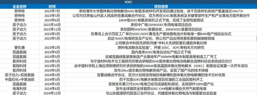 Le développement des SOEC a été relativement lent en raison des limitations d'application. En 2024, seules quatre entreprises ont progressé dans les SOEC. Par exemple, Stack Technology a lancé le premier électrolyseur SOEC au monde couplé à la production d'hydrogène à partir de gaz naturel en juin 2024, tandis que Yujing Technology a dévoilé sa troisième génération de pile SOEC en mars. Cependant, l'application pratique de ces piles est encore en phase de test dans des scénarios réels. Le développement des voies technologiques SOEC et des scénarios d'application reste un effort à long terme.