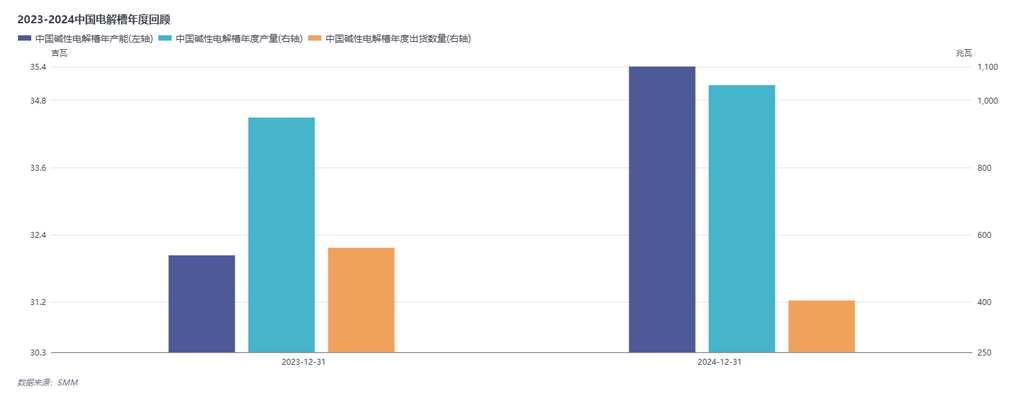 Graphique-2 : Statistiques annuelles de la capacité, de la production et des expéditions des électrolyseurs en Chine, 2023-2024