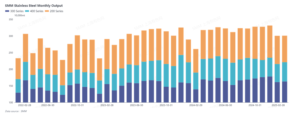 Le 28 février, selon les données de SMM, la production totale d'acier inoxydable en Chine en février 2025 a augmenté de 0,1 % par rapport au mois précédent et de 15 % par rapport à l'année précédente. Parmi celles-ci, la production de la série 200 a diminué de 5,9 % par rapport au mois précédent, tandis que les séries 300 et 400 ont respectivement augmenté de 1,2 % et 6,5 % par rapport au mois précédent.