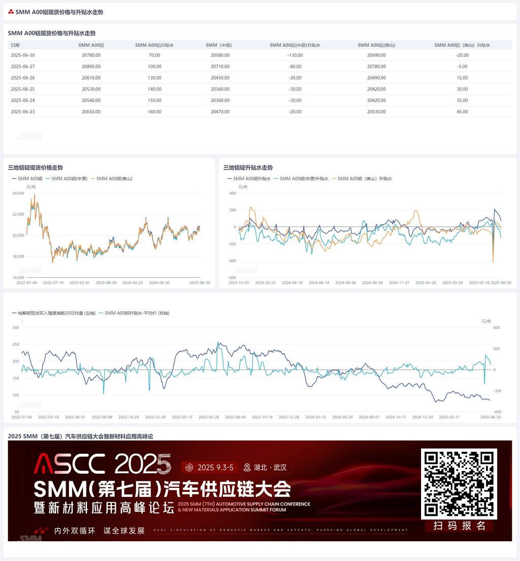 Aujourd'hui, les cours de l'aluminium sur la SHFE ont baissé en matinée en raison d'une légère accumulation des stocks d'aluminium en lingots. Le marché au comptant était morose. Couplé à la période semestrielle, il y avait une forte demande de rapatriement des fonds. Les fournisseurs de tous les niveaux ont proposé des rabais par rapport au prix en ligne, mais la demande en aval est restée faible, ce qui a entraîné une mauvaise tenue des transactions. En Chine orientale, le marché a initialement proposé un rabais de -20 à -10 yuan/t par rapport aux prix SMM en matinée, mais a progressivement basculé vers un rabais de -30 yuan/t. Aujourd'hui, l'aluminium A00 SMM était coté à 20 780 yuan/t, en baisse de 110 yuan/t par rapport au jour de transaction précédent, avec une prime de 70 yuan/t par rapport au contrat de juillet, se rétrécissant de manière significative de 30 yuan/t par rapport au jour de transaction précédent.