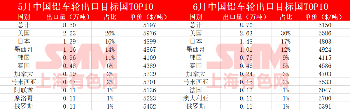 Les études de marché de l'aluminium de SMM indiquent les changements suivants dans la répartition des destinations d'exportation des roues en aluminium chinoises en juin, qui méritent l'attention du marché :
