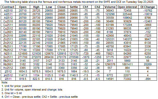 Le tableau suivant présente l'évolution des métaux ferreux et non ferreux sur le SHFE et le DCE le 23 septembre 2025.