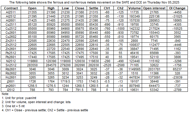 Le tableau suivant présente l'évolution des métaux ferreux et non ferreux sur le SHFE et le DCE le 5 novembre 2025.