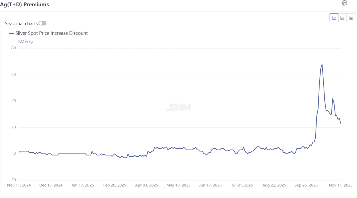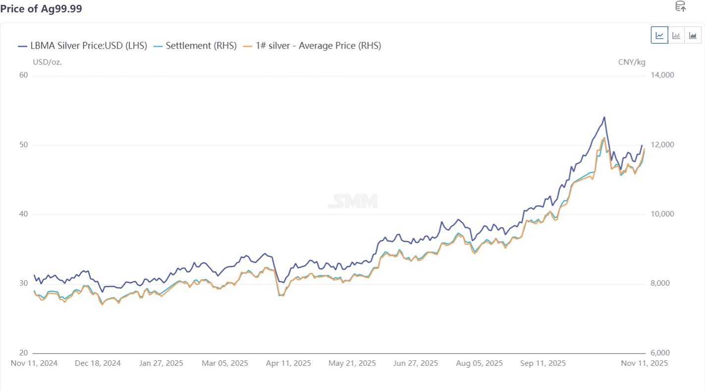 Selon une enquête du SMM, le squeeze à découvert sur le marché des lingots d'argent à Londres et l'ouverture de la fenêtre d'exportation en octobre ont conduit à une « priorité à l'exportation des gros lingots », maintenant l'offre spot de lingots d'argent tendue sur le marché intérieur. Cette situation ne s'est pas complètement améliorée en novembre, certaines fonderies s'attendant à ce qu'elle persiste jusqu'à la mi-décembre. De plus, en raison de jours consécutifs où les vendeurs à découvert du SGE ont choisi de payer des frais de report plutôt que de procéder à des livraisons physiques, les acheteurs à découvert du SGE ont rencontré des difficultés à retirer les marchandises. Au 11 novembre, la direction du règlement des frais de report du SGE indiquait « les vendeurs paient les acheteurs » depuis 12 jours de bourse consécutifs.