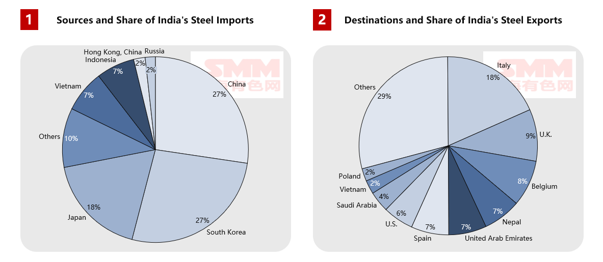 Une analyse plus approfondie des flux commerciaux géographiques montre que pour les exportations, l’Italie est la première destination de l’acier indien avec 1,75 million de tonnes, suivie par la Belgique, le Royaume-Uni et d’autres pays européens, démontrant la compétitivité-coût de l’Inde sur le marché de l’acier moyen et bas de gamme. Parallèlement, les exportations stables vers des pays voisins comme le Népal et les Émirats arabes unis soulignent ses avantages économiques régionaux. Cependant, les sources d’importation sont très concentrées, la Chine, la Corée du Sud et le Japon représentant collectivement 54 %, ce qui souligne la forte dépendance de l’Inde vis-à-vis des chaînes d’approvisionnement haut de gamme est-asiatiques durant sa montée en gamme industrielle. Ce schéma commercial reflète profondément la position réelle de l’industrie sidérurgique indienne dans la chaîne de valeur mondiale : disposant de capacités suffisantes pour répondre aux besoins nationaux de construction de base, mais stratégiquement limitée dans la fabrication haut de gamme.