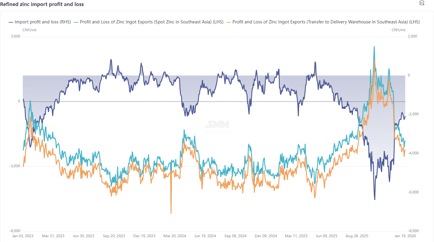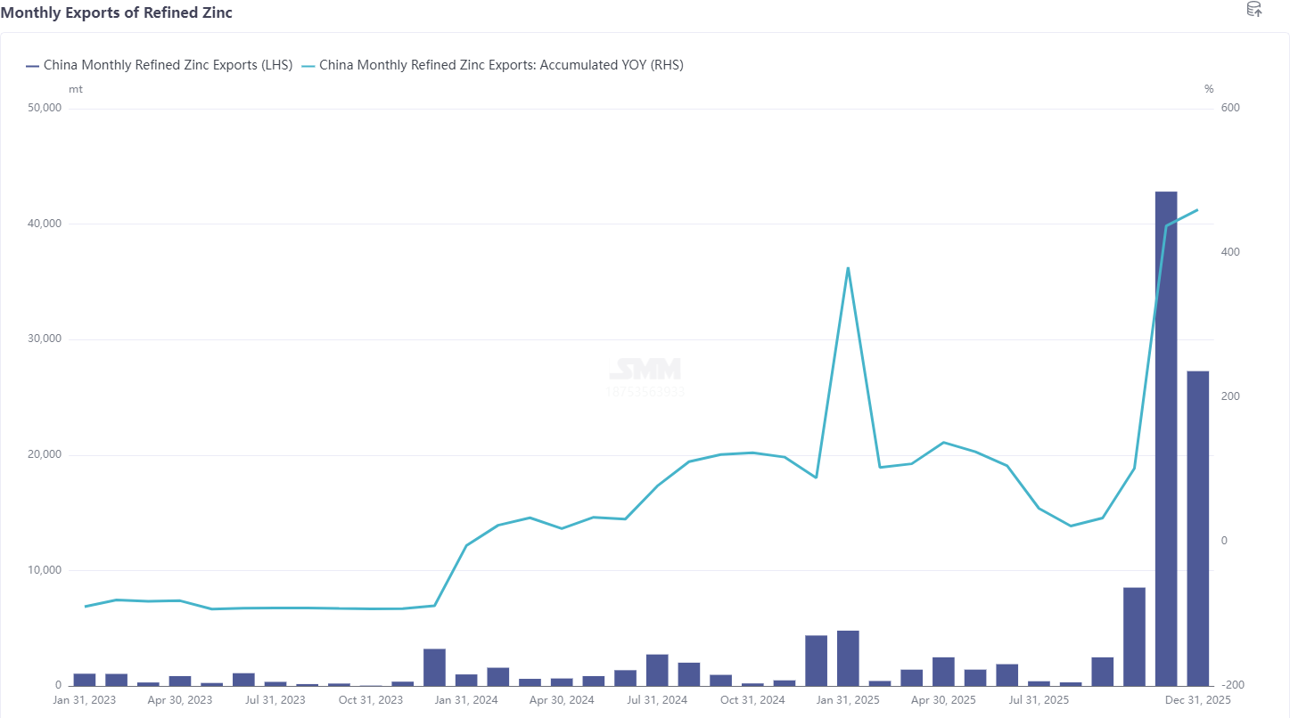 Par pays, les trois principales sources d’importation de zinc raffiné en décembre étaient le Kazakhstan (6 300 t, 72,26 %), l’Iran (1 400 t, 15,96 %) et l’Australie (700 t, 8,17 %). Les importations globales ont diminué avec la fermeture de la fenêtre d’exportation. Les exportations de zinc raffiné sont restées élevées en décembre, les trois premières destinations étant Taïwan, Chine (13 500 t, 49,37 %), Singapour (3 500 t, 12,87 %) et Hong Kong, Chine (3 000 t, 10,97 %). Dans l’ensemble, avec l’ajustement du ratio de prix zinc SHFE/LME, la fenêtre d’exportation du zinc raffiné s’est progressivement refermée mi-mois, et la perte à l’importation s’est réduite à environ 2 500 yuans/t.