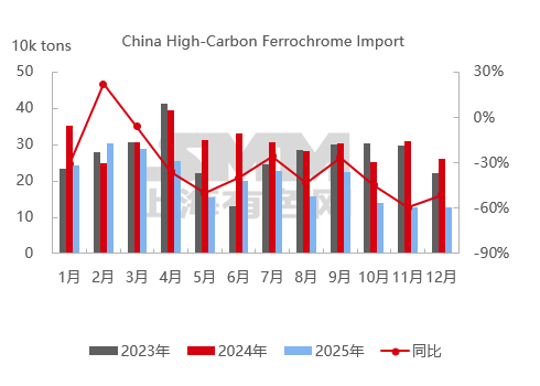 Sur l'ensemble de l'année 2025, les importations totales de ferrochrome à haute teneur en carbone ont été de 2,4457 millions de tonnes, soit une baisse de 33,1 % en glissement annuel. Parmi celles-ci, les importations d'Afrique du Sud ont totalisé 956 200 tonnes, en baisse de 47,5 % sur un an, et les importations du Kazakhstan ont atteint 1,0318 million de tonnes, en baisse de 16,6 % sur un an. La part de l'Afrique du Sud dans les importations de ferrochrome est tombée à 39,1 %, tandis que celle du Kazakhstan est passée à 42,19 %, bien que les importations globales de ferrochrome aient diminué.