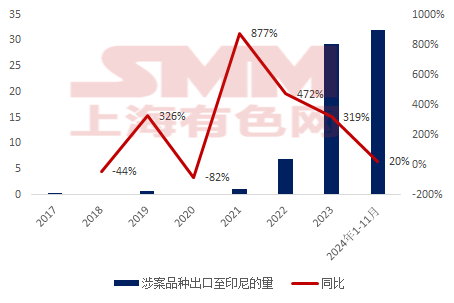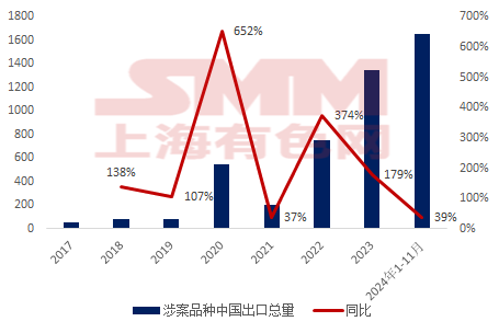 Menurut data dari Administrasi Umum Bea Cukai, sebelum 2020, volume ekspor produk yang terlibat dari Tiongkok tidak tinggi, dengan ekspor tahunan di bawah 1 juta mt. Setelah 2020, volume ekspor produk yang terlibat dari Tiongkok melonjak. Pada 2021, data sedikit menurun, tetapi setelah 2022, kembali ke puncaknya. Hingga November tahun ini, volume ekspor telah mencapai 16,497 juta mt, naik 38,69% YoY (volume ekspor 2023 untuk periode yang sama adalah 11,895 juta mt), sudah melampaui total tahun lalu!Gambar 2 - Total Volume Ekspor dan Data YoY Produk Tiongkok yang Terlibat, 2017-2024 (hingga November)