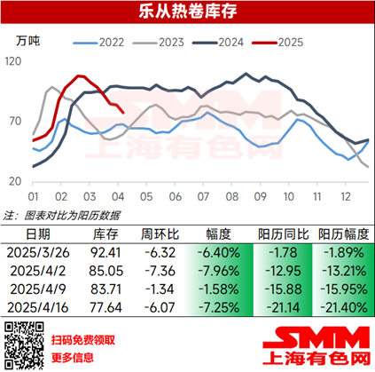 Minggu ini, persediaan HRC Lecong adalah 77,64 mt, turun 60.700 mt secara mingguan, penurunan sebesar 7,25%; penurunan tahunan sebesar 211.400 mt, penurunan tahunan sebesar 21,40%.