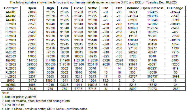 Berikut adalah pergerakan logam besi dan non-besi di SHFE dan DCE pada 16 Desember 2025