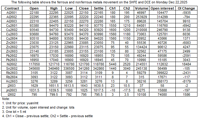 Tabel berikut menunjukkan pergerakan logam besi dan non-besi di SHFE dan DCE pada 22 Desember 2025.