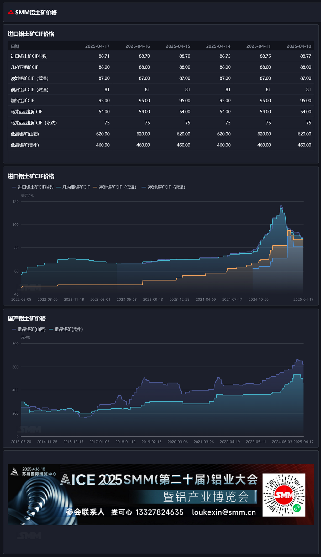 De acordo com os dados de 11 de abril, as chegadas totais semanais de bauxita nos portos domésticos foram de 5,7141 milhões de mt, um aumento de 2,5903 milhões de mt na comparação semanal; as partidas totais semanais de bauxita dos principais portos da Guiné foram de 3,9875 milhões de mt, uma diminuição de 328.000 mt na comparação semanal; as partidas totais semanais de bauxita dos principais portos da Austrália foram de 1,0815 milhão de mt, uma diminuição de 110.800 mt na comparação semanal.