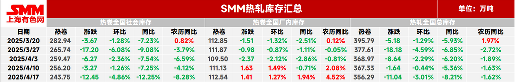 Esta semana, o estoque social de HRC foi de 2,4375 milhões de toneladas, uma queda de 124.500 toneladas semanal, uma redução de 4,86% na semana, 12,25% em relação ao ano anterior e 8,28% em comparação com o mesmo período do ano lunar.