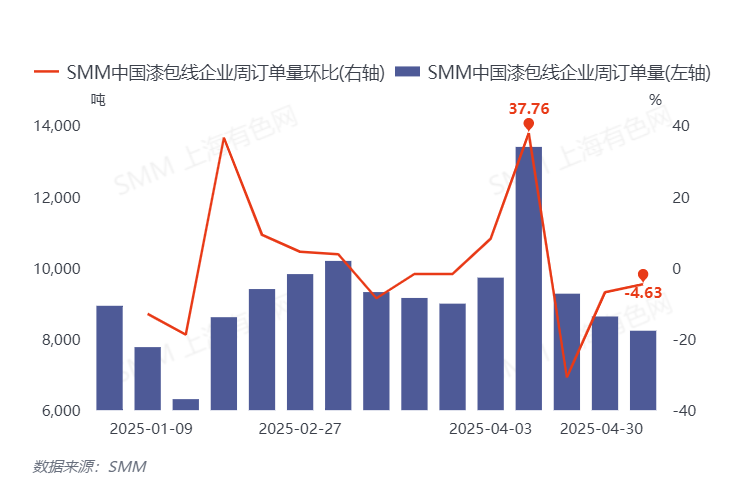 》Em termos de pedidos, de acordo com os dados da SMM, o aumento semanal de novos pedidos após o Festival Qingming chegou a 37,76%, mas o volume semanal de pedidos tem apresentado declínio por três semanas consecutivas desde meados do mês.》Recentemente, a disputa tarifária sino-americana e seu impacto na indústria de fios esmaltados se expandiram. As empresas relataram que os pedidos de eletrodomésticos terminais, ferramentas elétricas e outros produtos exportados para os EUA foram cancelados, levando a um declínio nos pedidos de fios esmaltados por transmissão em camadas.》Até a última semana de abril, os pedidos em mãos de algumas empresas de fios esmaltados não foram suficientes para sustentar uma alta taxa de operação. A indústria de fios esmaltados tem visto uma tendência de aumento dos estoques de produtos acabados e uma diminuição da taxa de operação.》Espera-se que o impacto da disputa tarifária nos pedidos da indústria de fios esmaltados continue a se manifestar. Com a aproximação da baixa temporada da indústria, há expectativas pessimistas para os pedidos da indústria de fios esmaltados em maio.