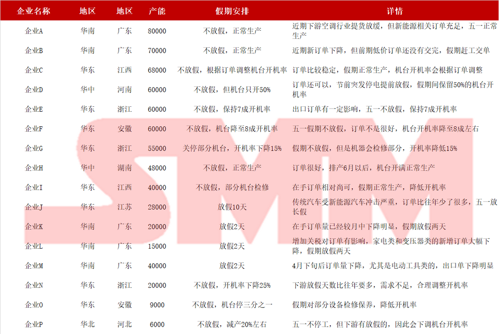 》À medida que o feriado do Dia do Trabalho se aproxima, as empresas de fios esmaltados finalizaram seus planos de produção e arranjos de férias para o período de férias. A SMM reuniu e compilou informações sobre os arranjos de produção de férias de algumas empresas de fios esmaltados. A seguir estão as situações de férias e pedidos de algumas empresas:
