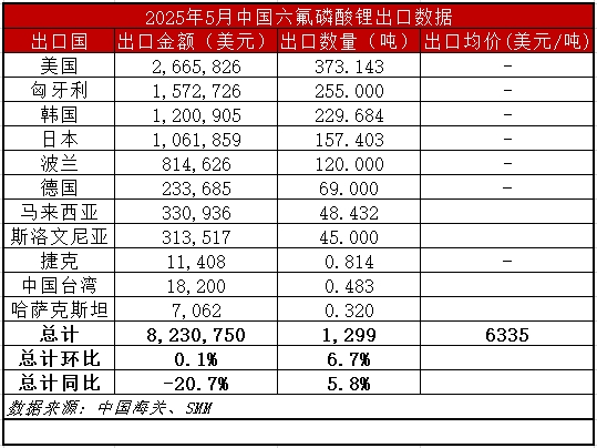 Em termos de exportações, a China exportou 1.299 toneladas de LiPF6 em maio de 2025, um aumento de aproximadamente 7% em relação a abril e de aproximadamente 6% em relação ao mesmo período do ano anterior. Especificamente, 120 toneladas de LiPF6 foram exportadas para a Polônia, uma queda de aproximadamente 67,7% em relação ao mês anterior; 157,403 toneladas foram exportadas para o Japão, uma queda de aproximadamente 22,7% em relação ao mês anterior; 229,684 toneladas foram exportadas para a Coreia do Sul, um aumento de aproximadamente 34,2% em relação ao mês anterior; e 373,143 toneladas foram exportadas para os EUA, um aumento de aproximadamente 250% em relação ao mês anterior, mostrando um aumento significativo.