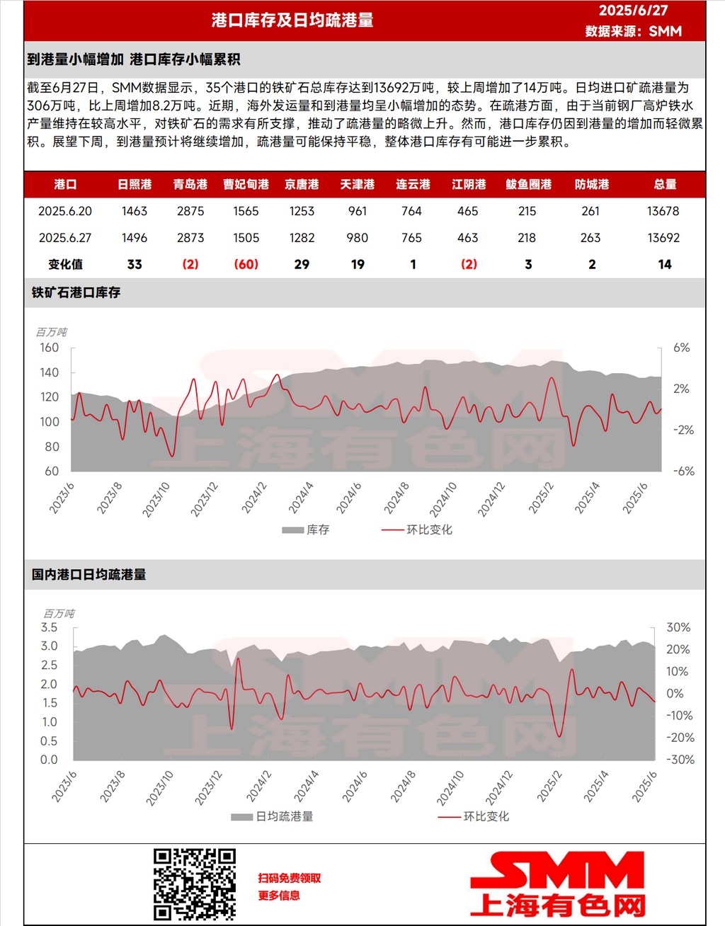 Em 27 de junho, dados da SMM mostraram que o estoque total de minério de ferro em 35 portos atingiu 136,92 milhões de toneladas, um aumento de 140 mil toneladas semanais. O volume médio diário de retirada de minério importado nos portos foi de 3,06 milhões de toneladas, um aumento de 82 mil toneladas em relação à semana anterior. Recentemente, tanto os embarques no exterior quanto as chegadas nos portos apresentaram uma tendência de aumento ligeiro. Em termos de retirada de carga nos portos, devido ao atual nível elevado de produção de ferro gusa nas altas fornalhas das siderúrgicas, houve algum apoio à demanda por minério de ferro, impulsionando um ligeiro aumento no volume de retirada nos portos. No entanto, o estoque nos portos ainda acumulou-se ligeiramente devido ao aumento nas chegadas. Olhando para a próxima semana, espera-se que as chegadas nos portos continuem a aumentar, enquanto o volume de retirada nos portos pode permanecer estável, e o estoque total nos portos pode acumular-se ainda mais.
