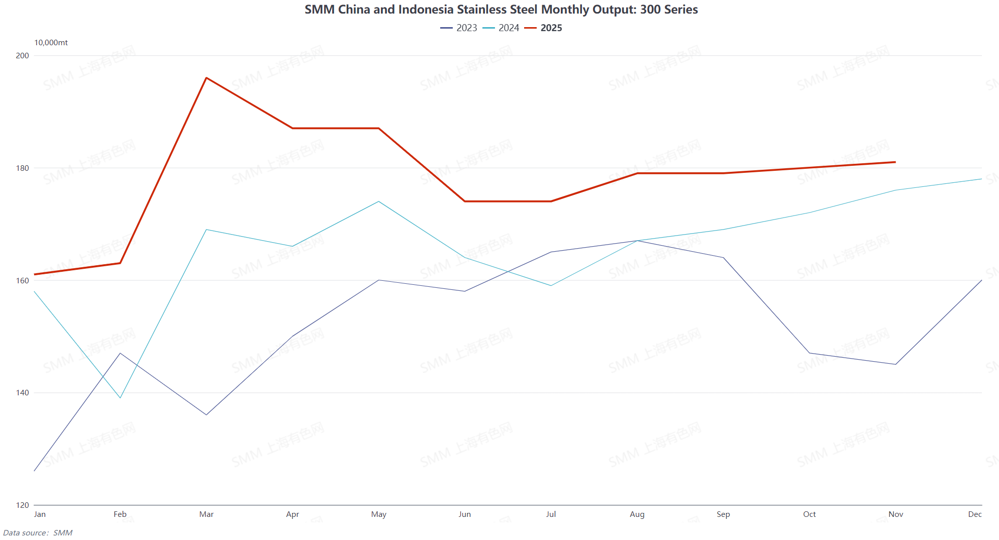 No lado da demanda, como principal aplicação a jusante do NPI, a produção de aço inoxidável da série 300 aumentou 7,48% em relação ao ano anterior no acumulado anual, mas a demanda apresentou flutuações significativas por fases. No primeiro semestre, a "alta temporada de março" do primeiro trimestre concretizou-se, com a demanda por aço inoxidável recuperando-se após o Ano Novo Chinês. Interrupções no fornecimento de matérias-primas pressionaram os preços à vista para cima, e a expansão das margens das siderúrgicas aumentou o ânimo para programar a produção. No segundo trimestre, impactadas pela tempestade de tarifas entre EUA e China em meados de abril, os preços futuros e à vista do aço inoxidável caíram abruptamente. Prejuízos contínuos nas siderúrgicas, somados à chegada do período tradicional de baixa do consumo, levaram a um acúmulo perceptível de estoques sociais, desacelerando o crescimento da produção e resultando em uma demanda fraca por fases. No segundo semestre, a "alta temporada de setembro" do terceiro trimestre começou, com a produção de aço inoxidável aumentando em termos mensais, elevando correspondentemente a demanda de compra por NPI de alto grau e sustentando brevemente uma recuperação na demanda por NPI. Após novembro, no quarto trimestre, com a entrada no período tradicional de baixa, o fraco consumo final causou quedas contínuas nos preços do aço inoxidável acabado e dificuldades na redução de estoques. Várias empresas de aço inoxidável iniciaram planos de corte de produção, com contrações simultâneas na produção das séries 300 e 200. A melhor economia da sucata de aço inoxidável pressionou ainda mais a procura, enfraquecendo o interesse de compra de NPI e reduzindo o suporte da procura.