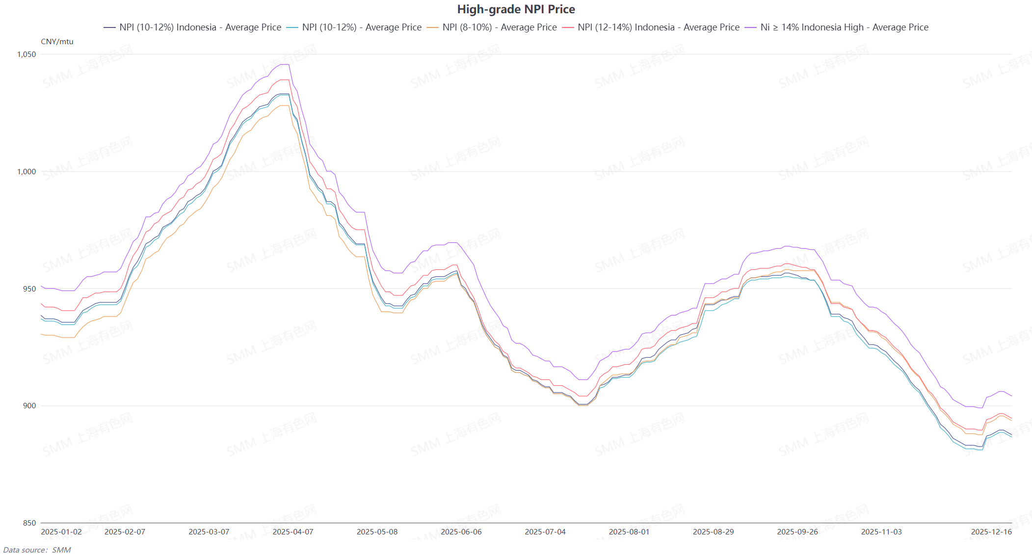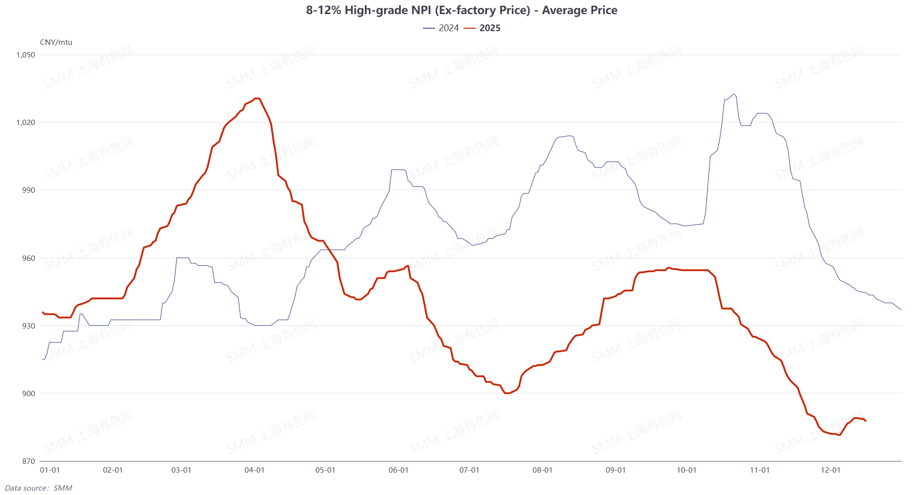 Em termos de preços, os movimentos do NPI de alto grau estiveram fortemente ligados aos fundamentos de oferta e procura, exibindo um padrão de flutuação em forma de "N": alta no primeiro trimestre, correção no segundo, estabilização no terceiro e queda acentuada no quarto. No primeiro trimestre, apoiado pela recuperação da procura por aço inoxidável e pela contração temporária da oferta na Indonésia, o preço médio do NPI indonésio de 10-12% (entregue no porto, com impostos pagos) subiu de um mínimo de 935,5 iuanes/mtu (entregue no porto, com impostos pagos) para 1.033 iuanes/mtu, um ganho de 10,42%. No segundo trimestre, o aumento das tarifas EUA-China desencadeou um feedback negativo no mercado de aço inoxidável, fazendo com que os preços do NPI de alto grau flutuassem em baixa a partir dos máximos, com uma queda acumulada de 11,62% no trimestre. No terceiro trimestre, tanto a oferta quanto a procura ofereceram suporte durante a temporada tradicional de pico, mantendo os preços em patamares elevados. No quarto trimestre, a procura entrou em colapso e os preços caíram abaixo da linha de suporte de custos, atingindo uma mínima de cinco anos em novembro, com uma ligeira estabilização no final do ano, dependendo do piso de custos.