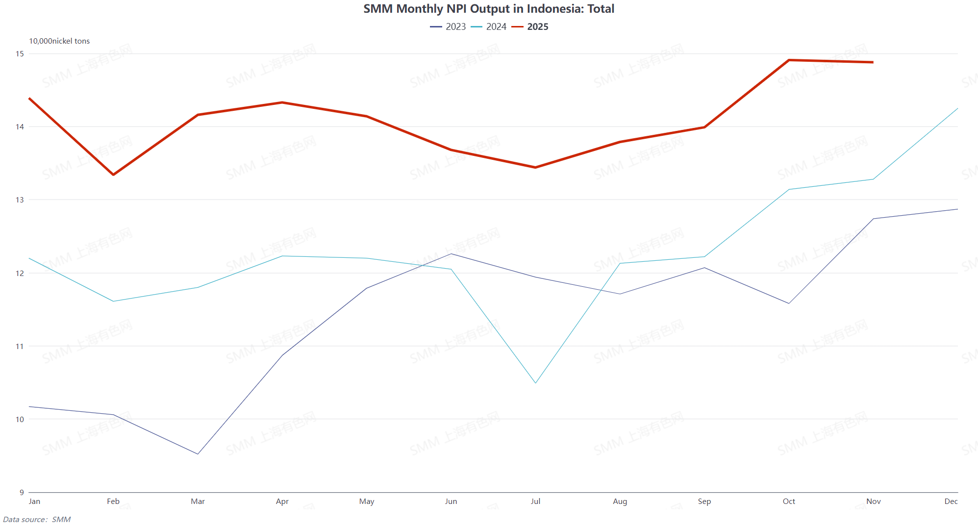 No lado da oferta, a produção global de NPI manteve crescimento anual, mas com divergência regional proeminente. A Indonésia, aproveitando a liberação contínua de nova capacidade e vantagens no fornecimento de matéria-prima, permaneceu a principal fonte de produção incremental, com produção anual aumentando 15,08% em relação ao ano anterior. A nova capacidade concentrou-se em áreas como a Ilha Obi e Halmahera. No geral, no primeiro semestre, a Indonésia foi afetada pela estação chuvosa e pela lentidão na aprovação de cotas RKAB, levando a um fornecimento apertado de minério de níquel, o que elevou os custos. O conteúdo metálico do NPI flutuou mensalmente de janeiro a junho, com algumas fundições operando em baixa capacidade devido a perdas. Após julho, com o fim da estação chuvosa e a obtenção de cotas, os preços do minério de níquel recuaram, aliviando a pressão sobre os custos. No segundo semestre, com a chegada da alta temporada de consumo, o conteúdo físico e metálico do NPI recuperaram-se mensalmente de agosto a outubro. A rentabilidade das fundições melhorou, combinada com a liberação de nova capacidade, levando a um crescimento estável da produção. Entrando na baixa temporada tradicional em novembro-dezembro, a demanda por aço inoxidável diminuiu e os estoques permaneceram altos, pressionando os preços do NPI. Algumas fundições realizaram manutenção e implementaram cortes de produção, resultando em um declínio marginal na produção.