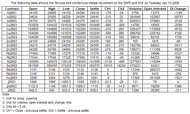 A tabela a seguir mostra o movimento de metais ferrosos e não ferrosos na SHFE e na DCE em 13 de janeiro de 2026.