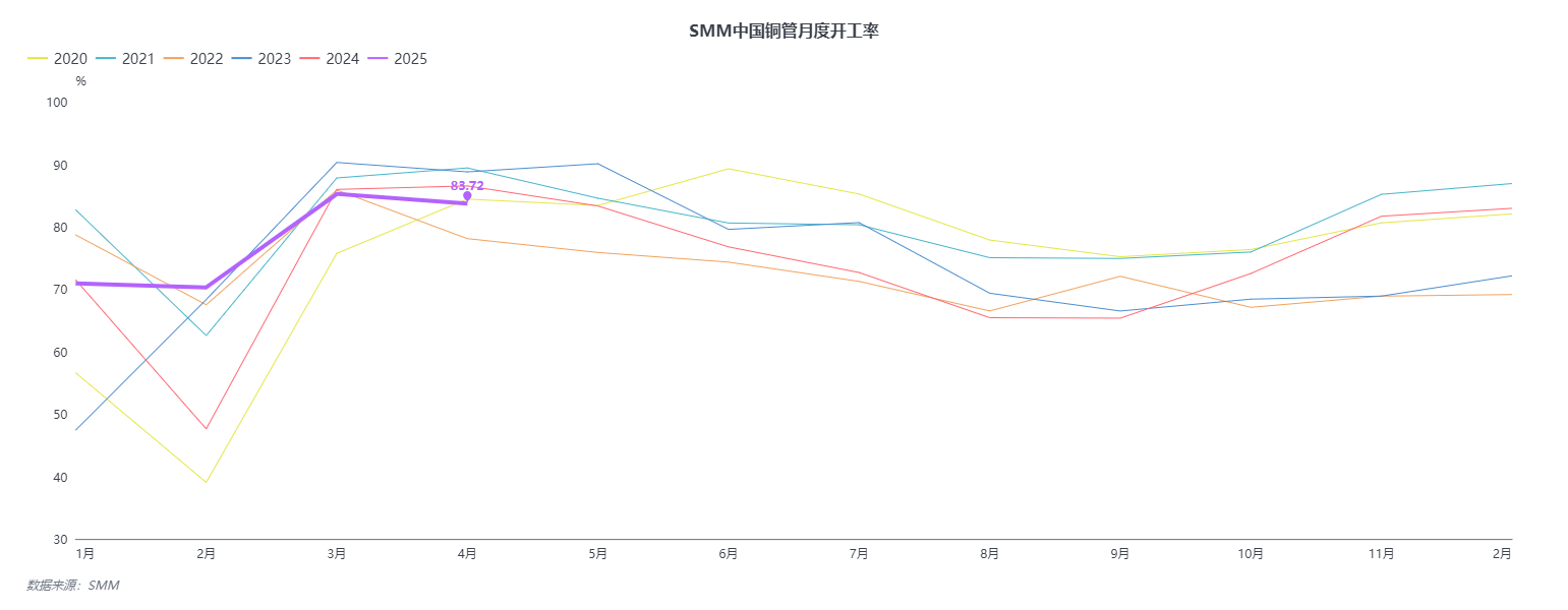 Согласно данным SMM, в апреле коэффициент загрузки мощностей предприятий по производству медных труб составил 83,72%, что на 1,51 процентного пункта ниже по сравнению с предыдущим месяцем и на 2,81 процентного пункта ниже по сравнению с аналогичным периодом прошлого года. Фактический коэффициент загрузки мощностей по производству медных труб в апреле был несколько ниже ожидаемого, но оставался на высоком уровне. Основной причиной стало то, что влияние тарифов не оказало существенного влияния на заказы, уже подтвержденные в апреле, и были случаи продления сроков поставки, что привело к переносу некоторых заказов на май. В результате общий коэффициент загрузки мощностей в апреле был примерно на 2% ниже ожидаемого. Крупные предприятия отметили, что в апреле не было существенного влияния на экспорт кондиционеров и медных труб. Однако заказы OEM-производителя, в основном экспортируемые в Северную Америку из Юго-Восточной Азии, были серьезно затронуты, что может привести к снижению коэффициента загрузки мощностей по производству медных труб в Юго-Восточной Азии раньше, чем на внутреннем рынке. Заказы средних и малых предприятий были относительно сбалансированными, и влияние тарифов пока не было заметно. Однако апрель, традиционно пиковый месяц, не показал более сильных результатов по сравнению с предыдущим годом, и рынок сплавных труб продолжал сдерживать рост.