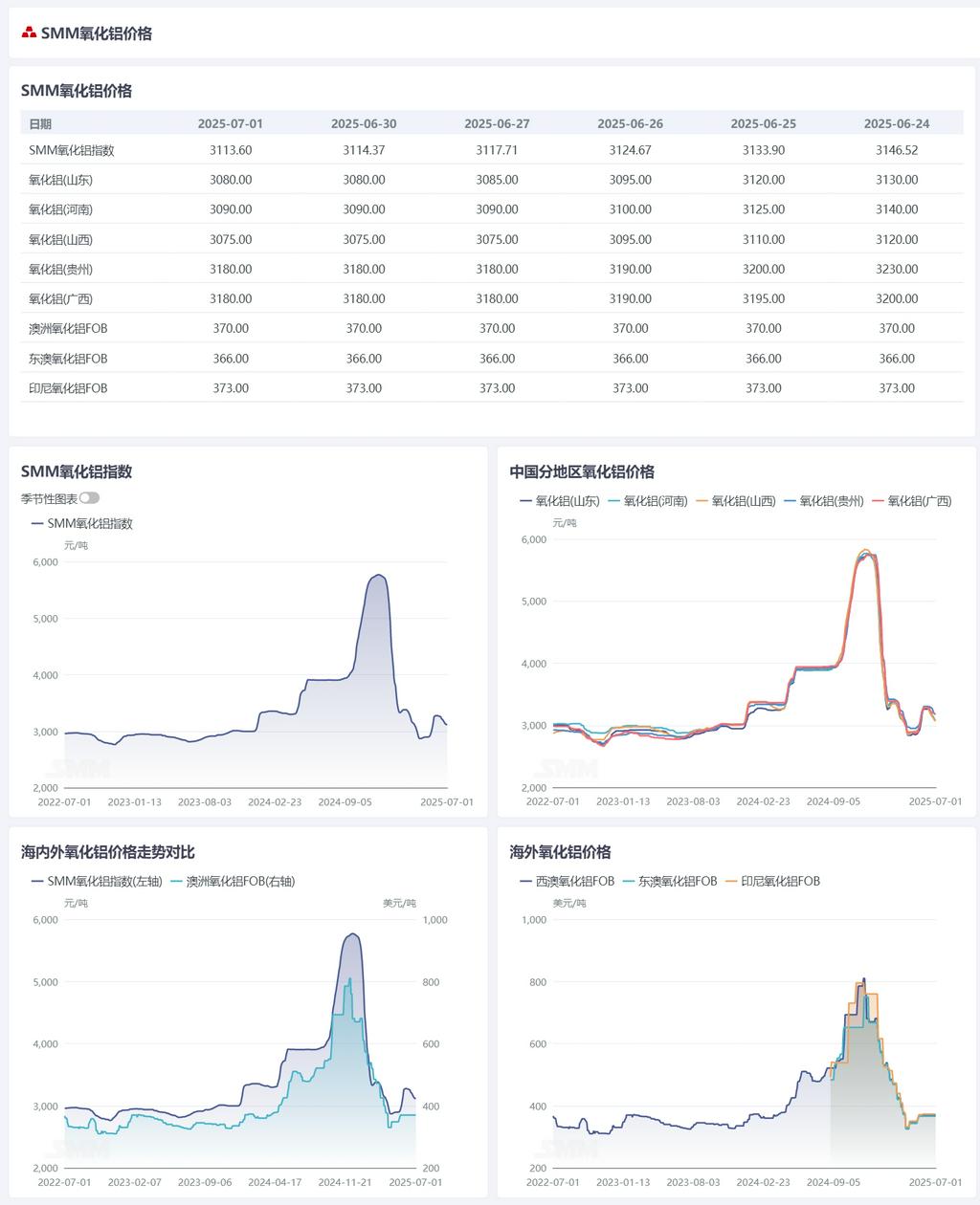 Зарубежный рынок: По состоянию на 1 июля 2025 года цена алюминиевого оксида FOB Западной Австралии составляла 370 долларов США/тонну, с морской фрахтовой ставкой в 21,9 доллара США/тонну. Продажный курс доллара США/юаня составлял около 7,18. Эта цена переводится в внешнюю продажную цену примерно в 3260 юаней/тонну на основных внутренних портах, что на 146 юаней/тонну выше внутренней цены на алюминиевый оксид. Окно импорта алюминиевого оксида остается закрытым.
