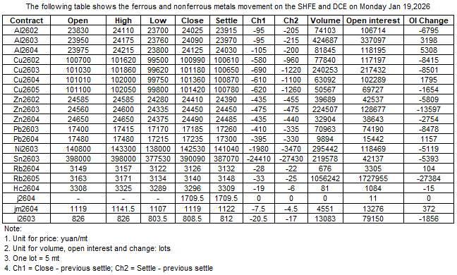 В следующей таблице показано движение черных и цветных металлов на Шанхайской и Даляньской биржах 19 января 2026 года.