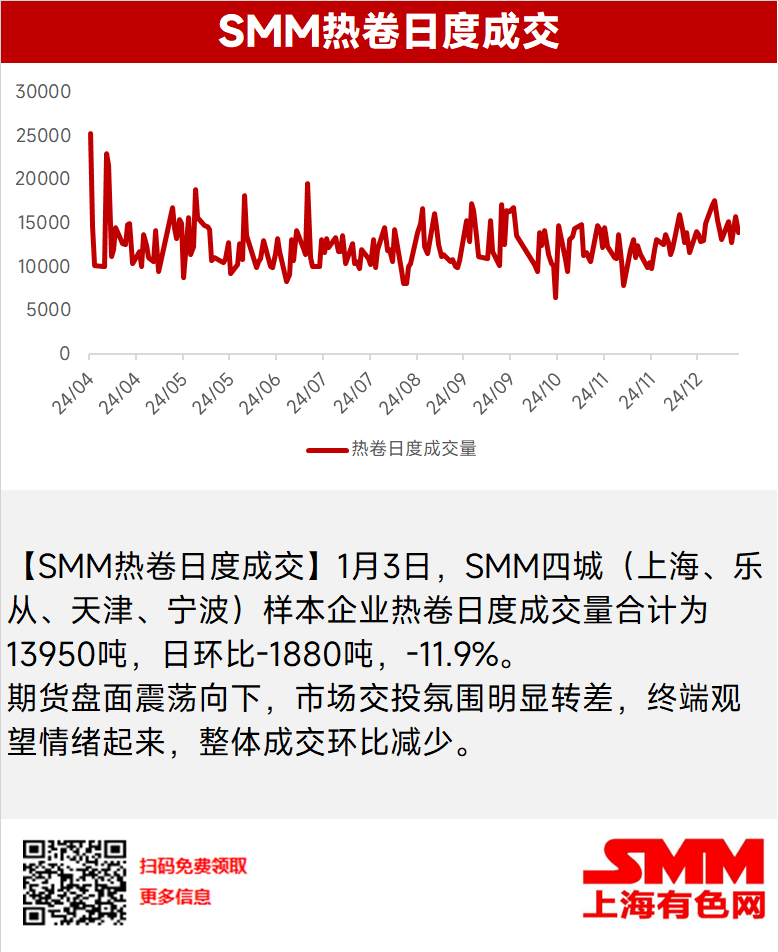 [ปริมาณการซื้อขายรายวันของ HRC โดย SMM] เมื่อวันที่ 3 มกราคม ปริมาณการซื้อขายรายวันของ HRC ในกลุ่มตัวอย่างของบริษัทใน 4 เมือง (เซี่ยงไฮ้, เล่อชง, เทียนจิน, หนิงโป) ที่ติดตามโดย SMM รวมทั้งหมด 13,950 ตัน ลดลง 1,880 ตัน (-11.9%) เมื่อเทียบกับวันก่อนหน้า