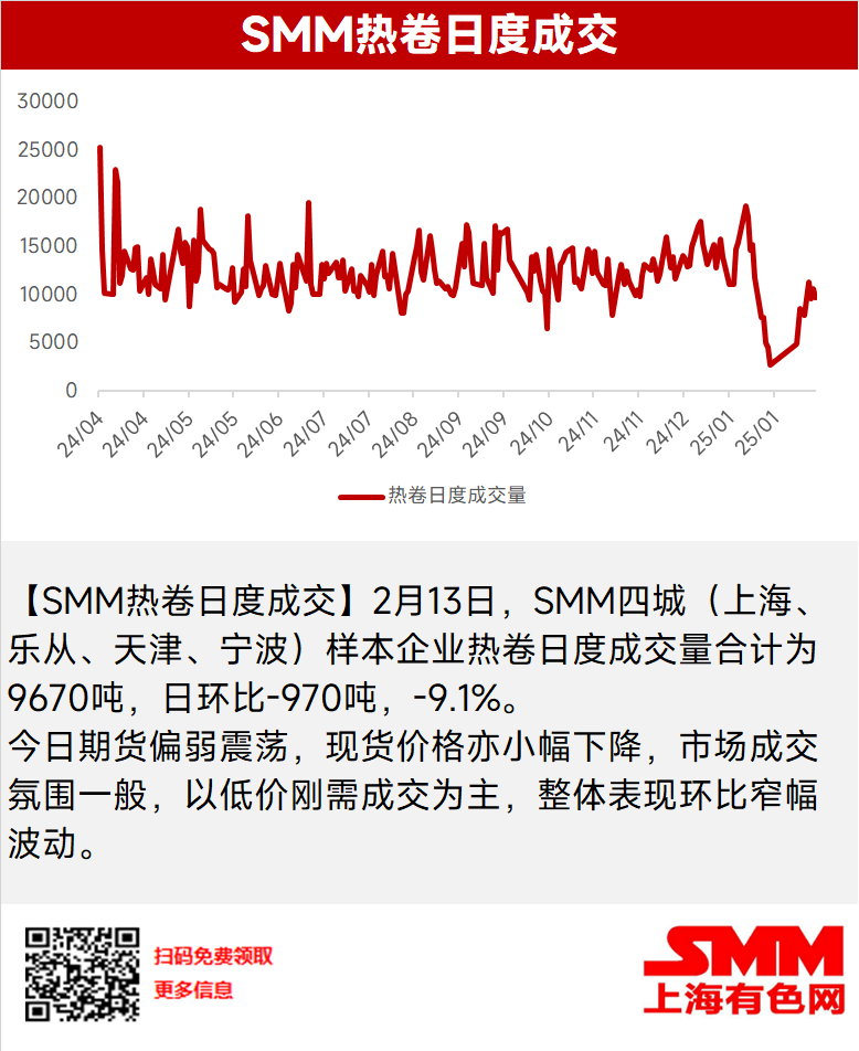 [ปริมาณการซื้อขายรายวัน HRC โดย SMM] เมื่อวันที่ 13 กุมภาพันธ์ ปริมาณการซื้อขายรายวันของ HRC จากตัวอย่างบริษัทใน 4 เมือง (เซี่ยงไฮ้, เล่อชง, เทียนจิน, หนิงโป) ที่ติดตามโดย SMM รวม 9,670 ตัน ลดลง 970 ตัน หรือ 9.1% เมื่อเทียบรายวัน